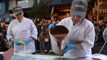 La elaboración de la barra, corazón de la fiesta, requiere de una sincronización perfecta. Decenas de trabajadores del sector chocolatero local volcaron el chocolate templado sobre la extensa mesa para luego esparcirlo y decorarlo antes de que solidificara, en un espectáculo visual que fue seguido con aplausos y emoción por miles de personas.