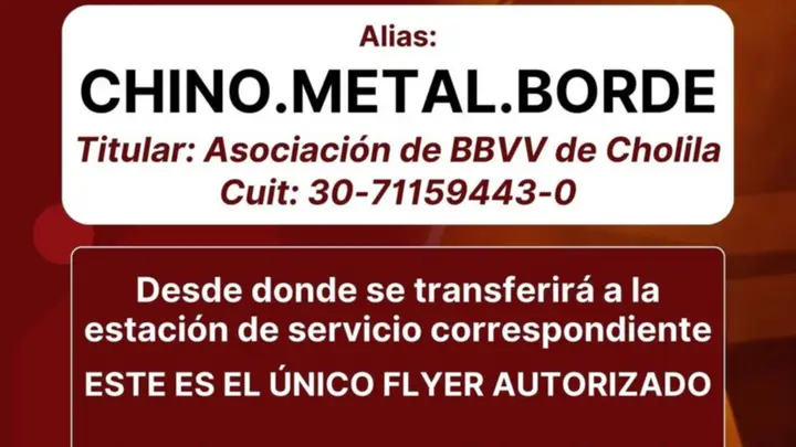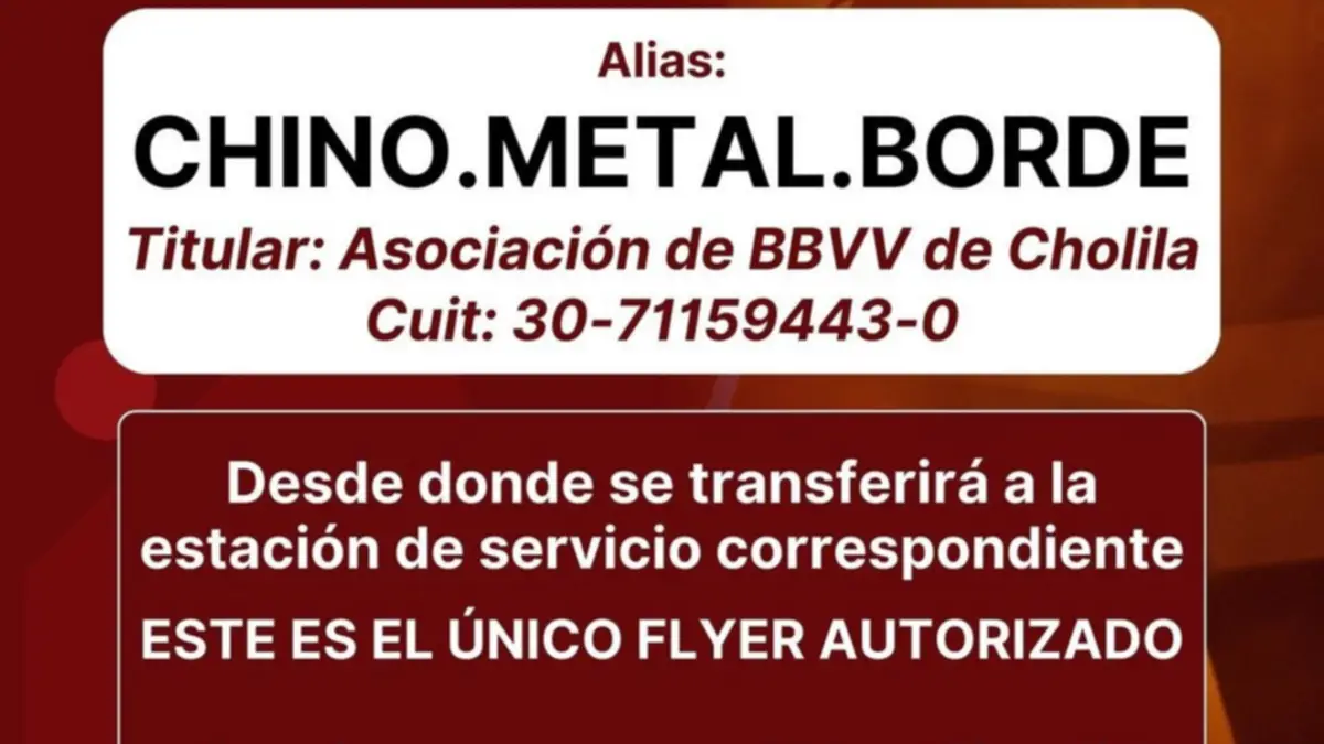 El alias autorizado es CHINO.METAL.BORDE, a nombre de la Asociación de Bomberos Voluntarios de Cholila. Los fondos transferidos serán destinados directamente a la estación de servicio que abastece a los móviles y maquinarias que trabajan en el combate del fuego.