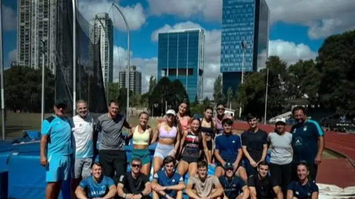 Quince atletas, entre ellos Martínez, Conesa, T. Villegas, L. Villegas, Ciampiti, Londero, Napolitano, Guidetti, Sagasta, Ferrencio, Lamboglia, Koss, Harte y Fritzsche, entrenan intensamente en la pista, acompañados por un equipo de entrenadores compuesto por Garzón, Prins, Dulcic, Gómez, Morillas y Díaz.