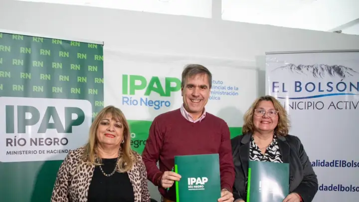El intendente Bruno Pogliano, en representación de la Municipalidad de El Bolsón, y Juana Benítez, presidenta del Instituto Provincial de Administración Pública (IPAP), han firmado un Convenio Marco de Cooperación con el objetivo de potenciar la capacitación y formación de los empleados municipales.