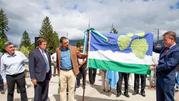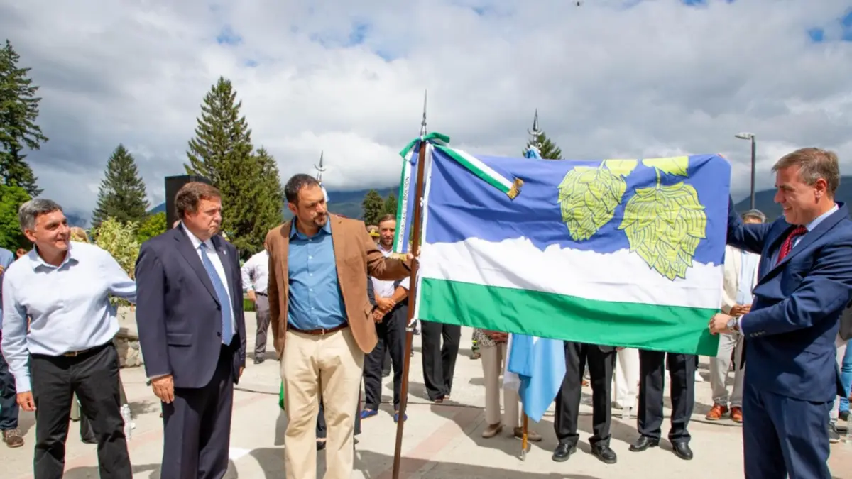 Uno de los momentos más destacados fue la presentación oficial de la Bandera de la Ciudad de El Bolsón, creada especialmente en el marco del Centenario como símbolo de identidad, memoria colectiva y proyección hacia el futuro. El diseño fue elegido mediante concurso público y pertenece a la vecina Cecilia Noemí Conar.