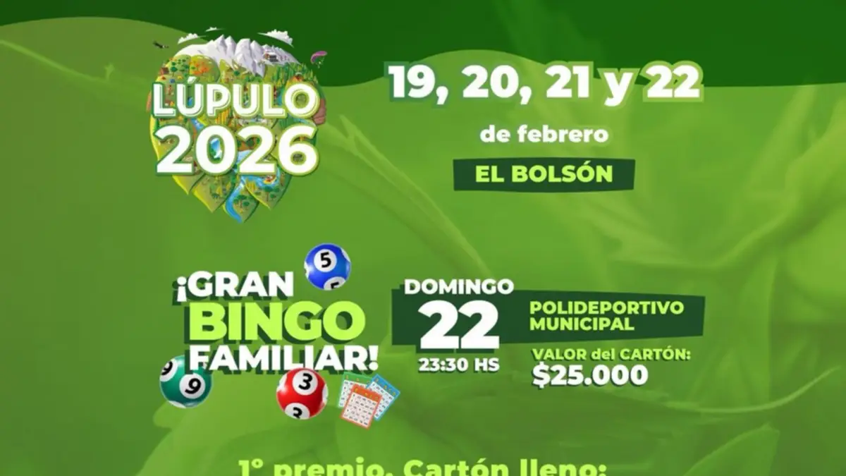 La Municipalidad de El Bolsón anunció la realización del Gran Bingo Familiar de la Fiesta Nacional del Lúpulo 2026, que tendrá lugar el domingo 22 de febrero a las 23:30 horas en el Polideportivo Municipal, como parte del esperado cierre de la celebración más convocante de la localidad.
