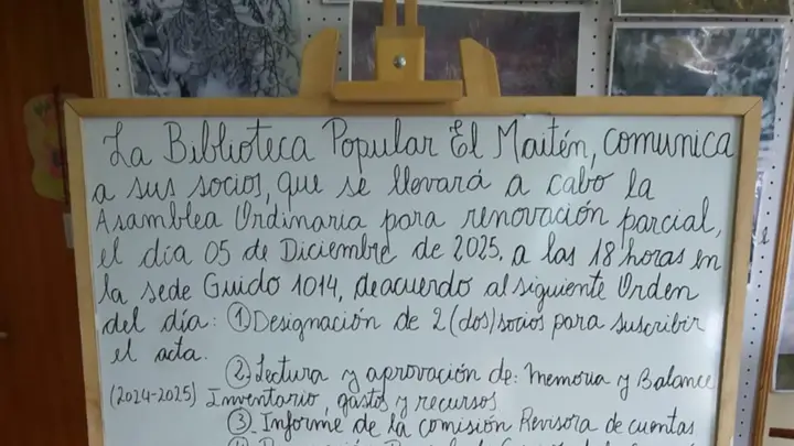 La Biblioteca Popular “El Maitén” informó que el próximo 5 de diciembre de 2025, a las 18 horas, se realizará la Asamblea Ordinaria en su sede ubicada en Guido 1014. La jornada incluirá la renovación parcial de cargos y el tratamiento de la documentación institucional.
