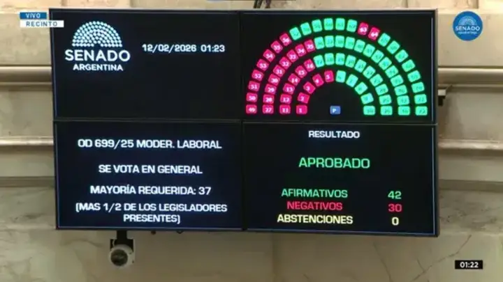Después de una extensa sesión que superó las 16 horas, el Senado aprobó la reforma laboral impulsada por el Gobierno libertario y aliados, relegando al kirchnerismo. La iniciativa pasó con 42 votos a favor y 30 en contra y ahora será remitida a la Cámara de Diputados para su sanción definitiva, donde el oficialismo mantiene la mayoría.