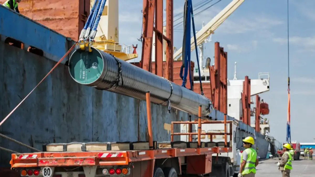 Estos caños forman parte del primer embarque crítico de tuberías para la construcción del gasoducto asociado al proyecto Argentina FLNG, impulsado por el consorcio Southern Energy y destinado a abastecer las futuras plantas flotantes de licuefacción frente a la costa rionegrina.