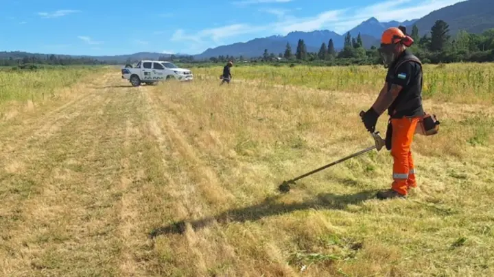 En el Aeródromo de El Bolsón se realizó una intervención integral que incluyó la confección de cartelería general para todo el predio, con acompañamiento de Vialidad Rionegrina, y el cerramiento perimetral completo con alambrado. Esta obra resguarda la seguridad de la comunidad, teniendo en cuenta la ubicación del aeródromo y la proximidad de zonas habitadas. Además, se llevaron adelante tareas de desmalezado y nivelación en los laterales de la pista y la calle de rodaje, abarcando más de 5.700 metros de superficie.